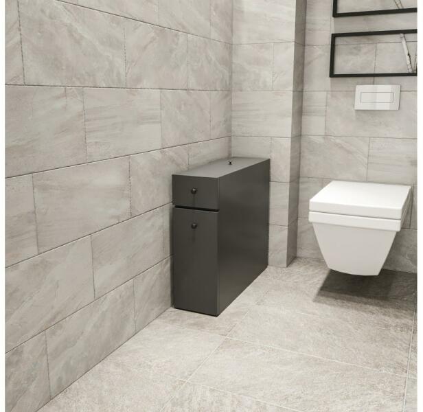 Tágas fürdőszobai szekrény. Egyszerű, modern stílusának köszönhetően bármely otthonba illik. Két fiók és egy tárolórekesz a szekrény felső részén. Antracit és fekete fogantyúk kombinációja. Laminált forgácslapból készült. Anyagvastagság: 1,8 cm. Maximális teherbírás: 8 kg. Ez a bútor darab előre összeszerelve érkezik, nincs szükség összeszerelésre.