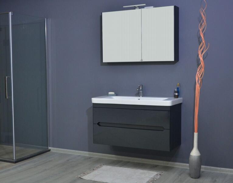 TMP SHARP 105 - ANTRACIT - Tükrös fürdőszobai szekrény - 100 cm A tükrös szekrény antracit szín ben, 2 külön nyitható ajtó val és LED-es világítás sal ellátott tükrös szekrény a fürdőszobai felszerelés rendkívül praktikus eleme. Egyesíti a bútorok és a tükör funkcionalitását, lehetővé téve a kozmetikumok és más apró tárgyak elrejtését, valamint a napi rutin elvégzését. A tükör elülső része a hagyományos tükör helyébe lép, ennek eredményeként a mosdó feletti helyet jól kihasználja. A modern és energiatakarékos LED-es világítás előnye, hogy a bútordarab megvilágítja a fürdőszobát, így hangulatos légkört teremt. A kiváló minőség és az igényes kivitelezés esztétikája azt jelenti, hogy a Sharp fürdőszobai tükrös szekrénye egy igen eredeti elrendezést tesz lehetővé. A bútort összeszerelt állapotban szállítjuk ezzel is időt és enegiát spórolva Önnek. Minőségi komplett fürdőszoba bútor tökéletesen összeszerelve és sérülésmentesen szállítva! Sharp 100 tükrös szekrény LED világítással, antracit szürke (100 cm) Sharp 105 Fali fürdőszoba bútor, antracit szürke Sanovit LUXURY 105 cm es kerámia modsóval (csaptelep nem tartozék)
