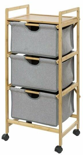 A fürdőszobai könyvespolc három kosár alakú fiókkal rendelkezik, amelyek pamut és műszál keverékéből készültek. - szélesség: 34 cm- hossz: 44 cm- magasság: 96 cm- 3 polc kosár formájában- 1 polc a termék felső részében- stabil szerkezet- fékkel ellátott görgők, amelyek megakadályozzák, hogy az állvány magától elmozduljon- anyag: bambusz, pamut- szín: barna, szürke